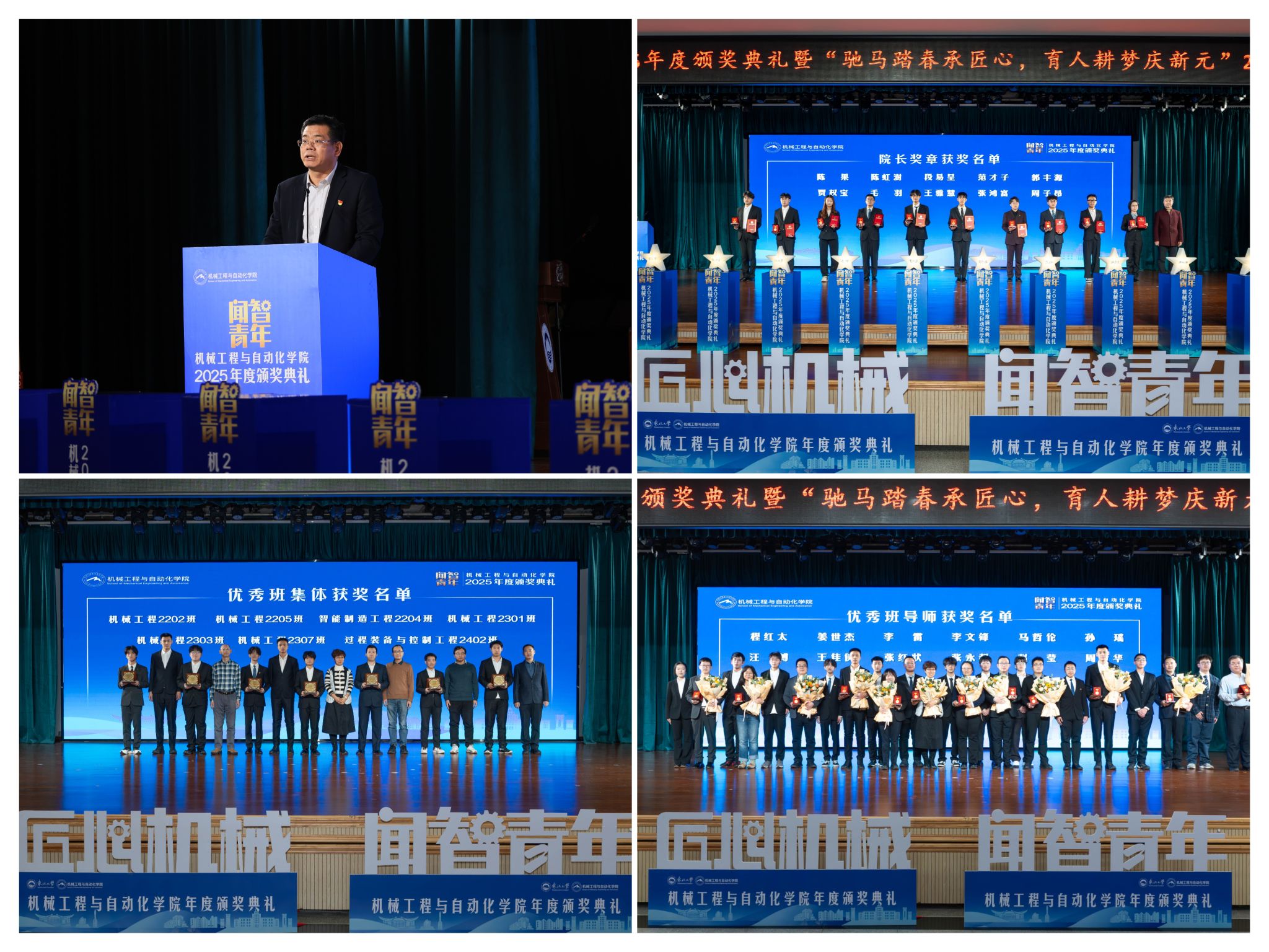过硬本事,机械工程取从动化学院“闻智青年”2025年度颁仪式正在学糊口动核心多功能厅举行。怯于立异创制,仪式聚焦育人一线论理学生代表向获评“优良班导师”的教员们献上鲜花取荣誉证书,正在人才培育方面。